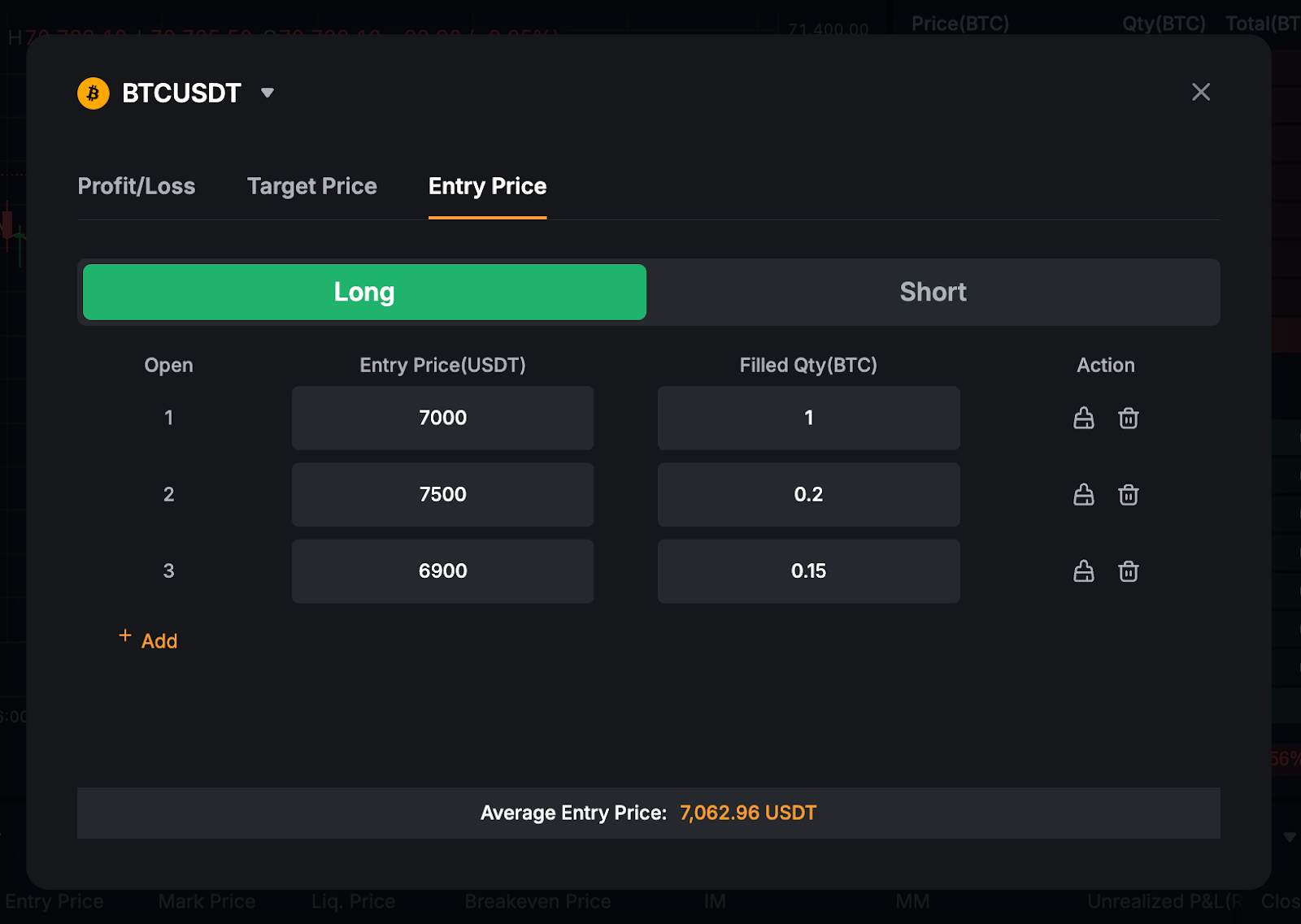请注意,现有仓位的合约数量和开仓均价可以在相应交易对的上方查看,在数量和入场价格字段旁边。