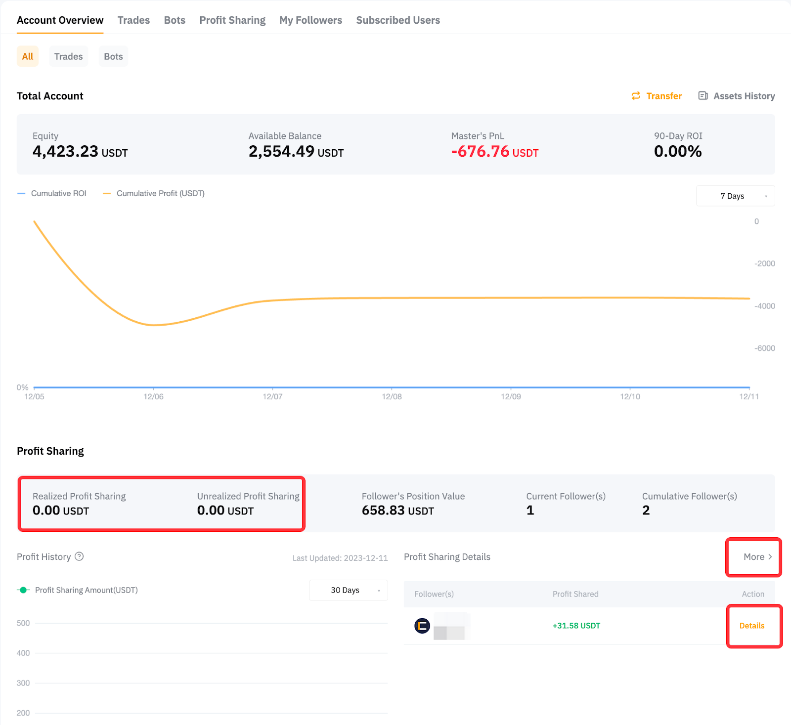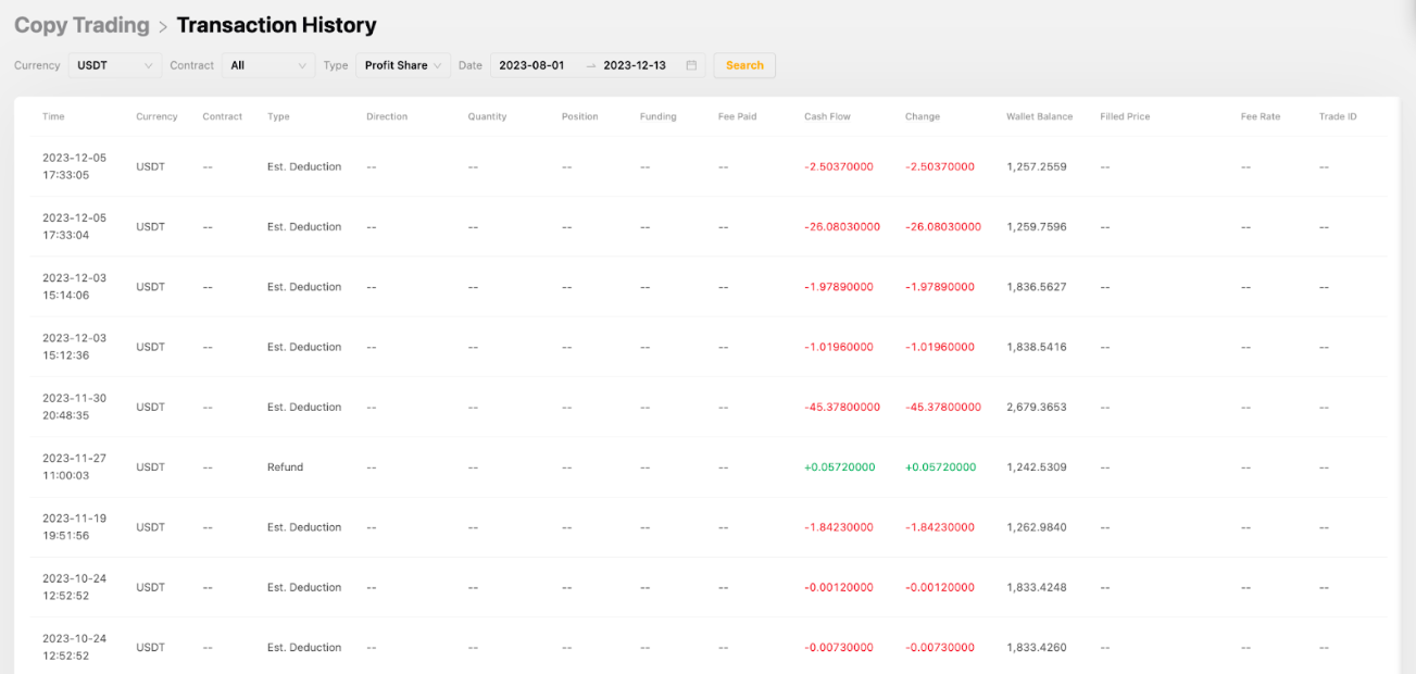 1. 系统每日会计算跟单用户的净盈亏,用于冲抵结算周期内的盈亏金额。系统会从每日收益中预先扣除相应的分润比例。在结算日当天,如果从跟单交易订单中预先扣除的收益高于实际分润金额,则超出部分将退还至跟单用户的资金账户,而分润金额则将记入交易达人的资金账户。