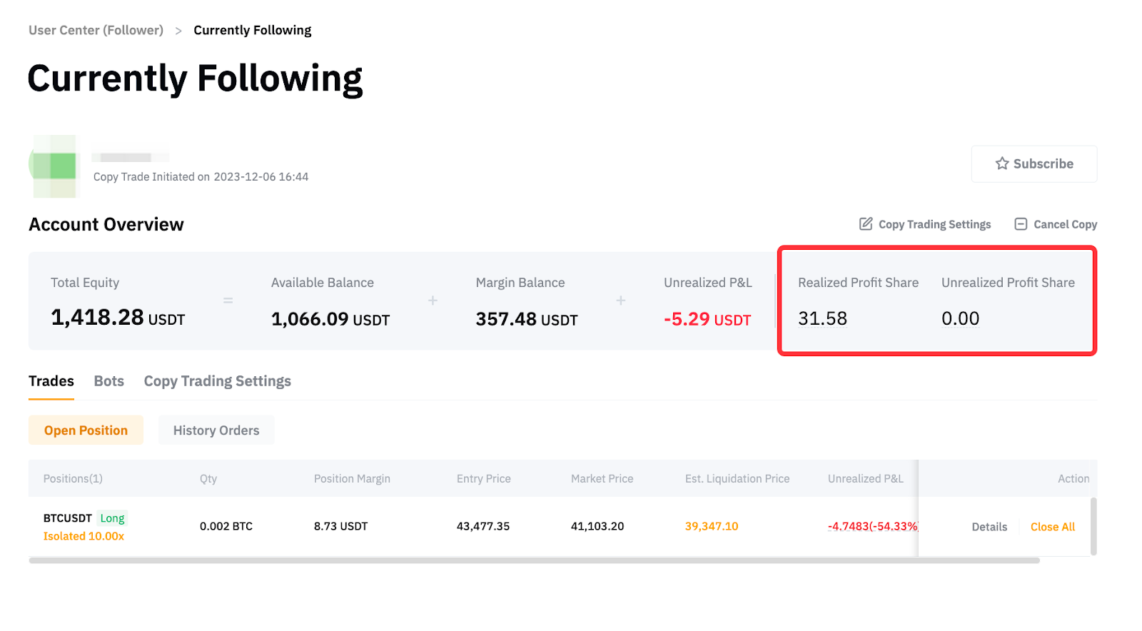 请前往跟单用户中心,您将能够看到 USDT 永续交易的已结分润和未结分润。
