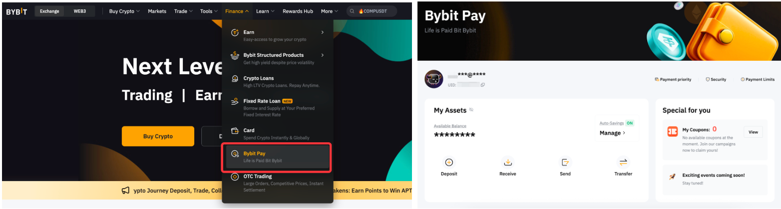如果您在 Bybit 网站上,请点击金融,然后点击 Bybit Pay。