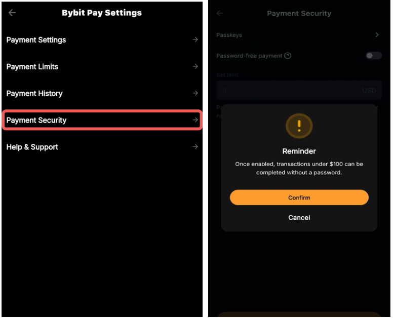 您可以通过 Bybit Pay 设置 → 支付安全来启用小额免密支付。