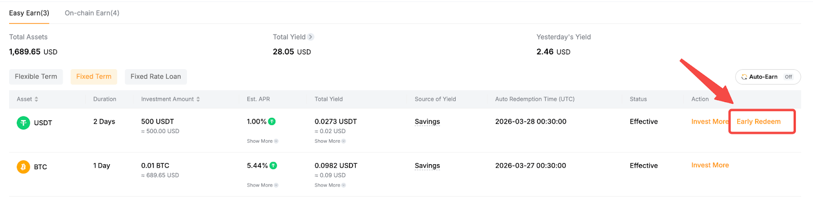 产品到期后才可赎回资产。 您的本金和收益将在收益分配日期分配至您的资金账户。 部分产品可能支持提前赎回,但年化收益率会降低或为零 — 请参阅产品页面了解详情。