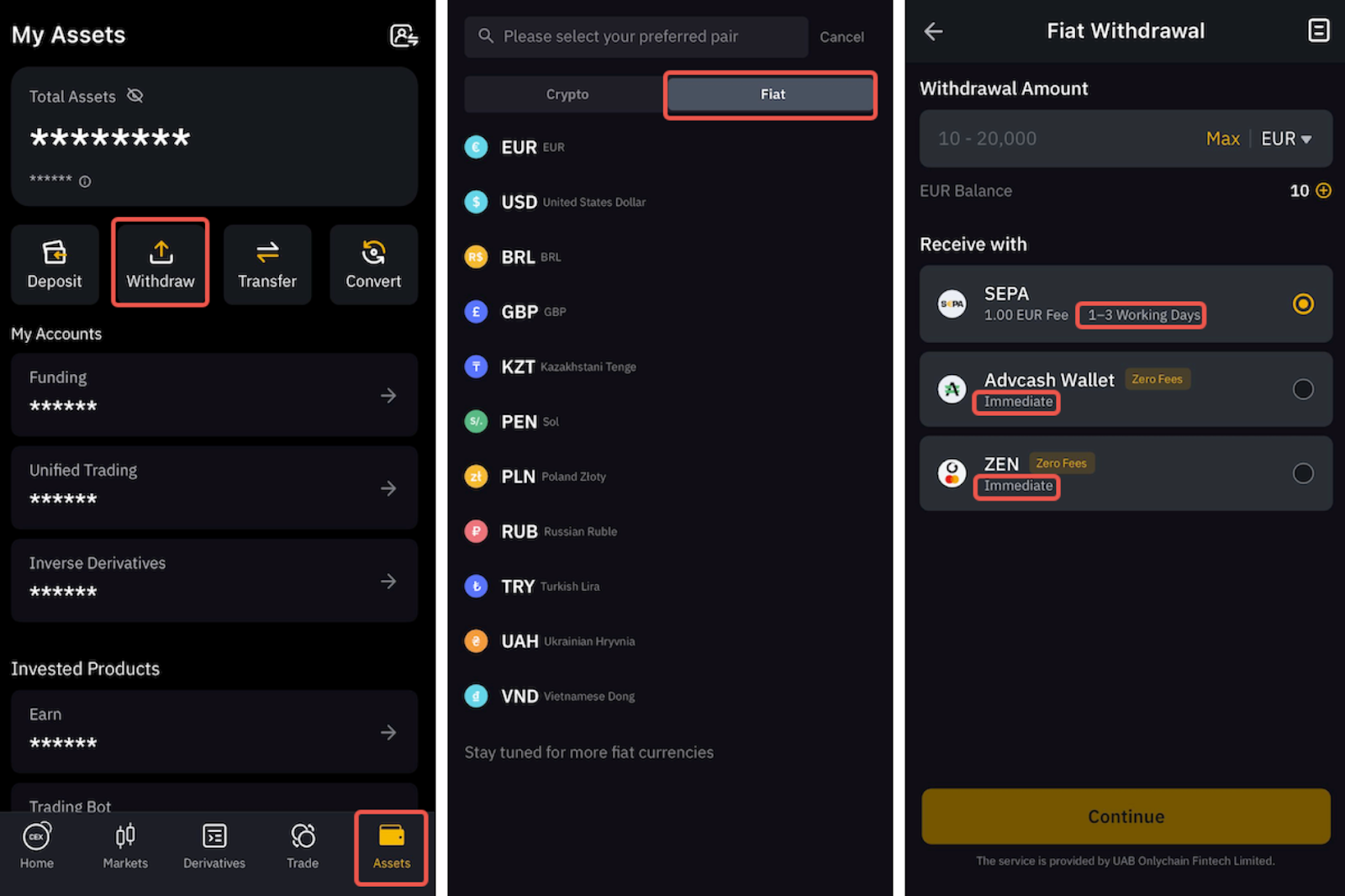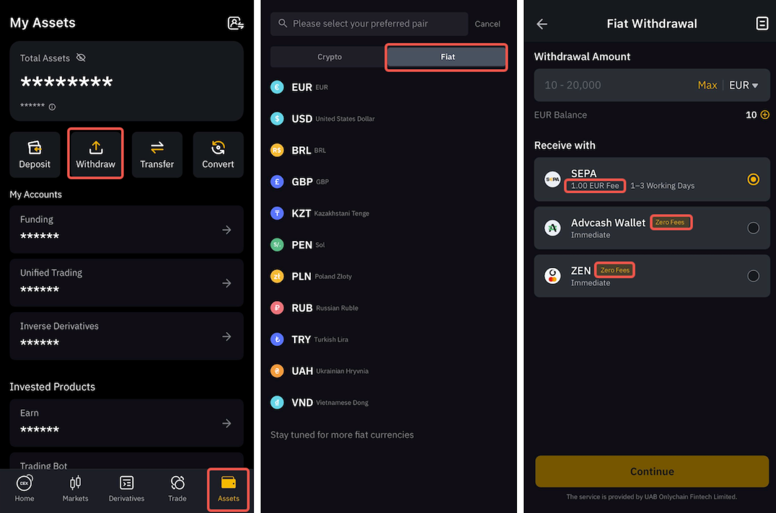 在 App 上,请前往资产选项卡,点击提币,然后切换至法币部分,以访问支持的法币列表。