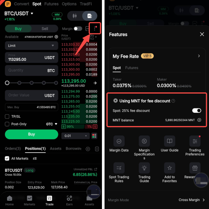 如果您正在使用应用程序,请点击交易页面上的三点图标,并打开使用 MNT 获取费用折扣选项。