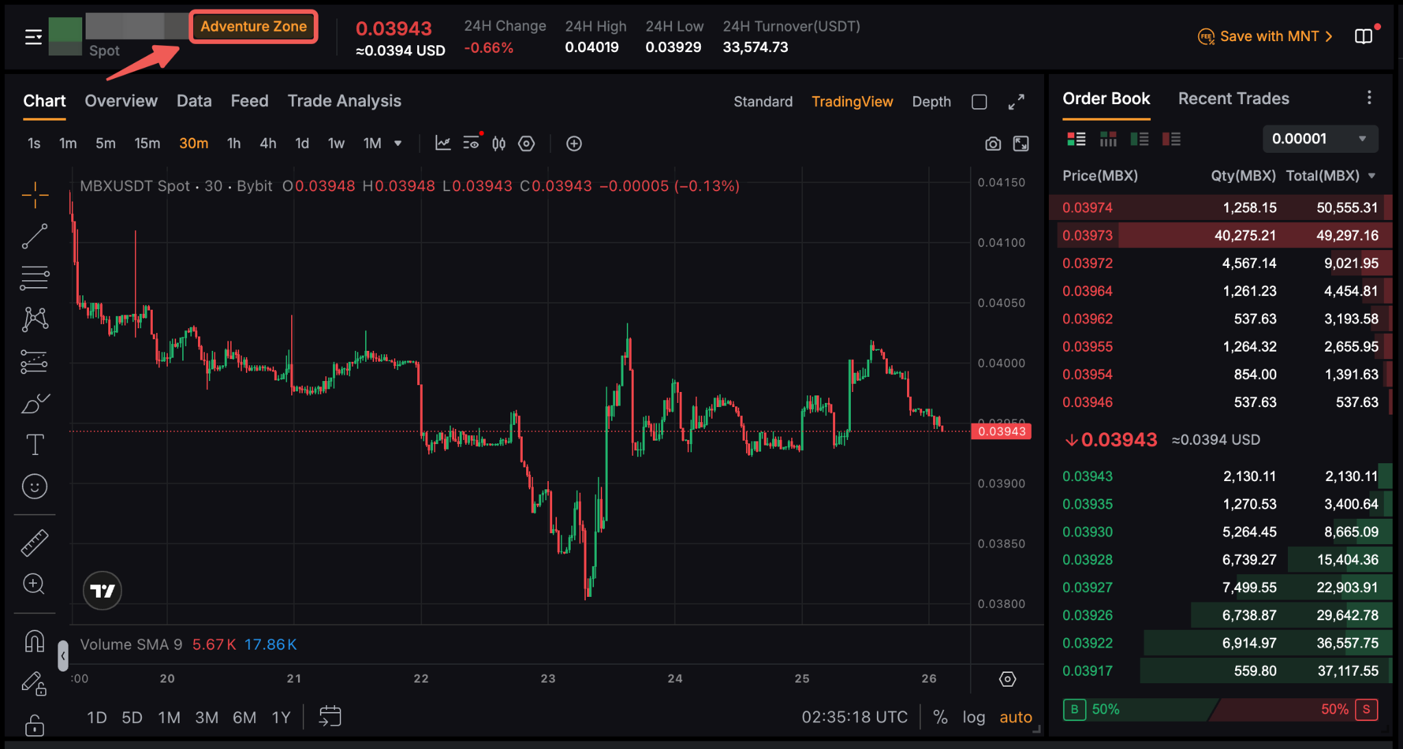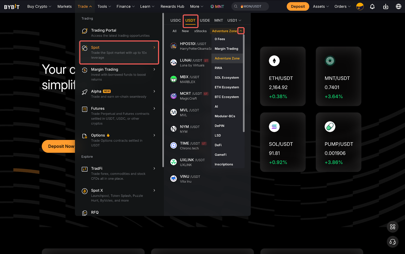 若要访问风险投资区及其交易对,只需点击交易 → 现货,然后在 USDT 下方的下拉菜单中选择风险投资区。