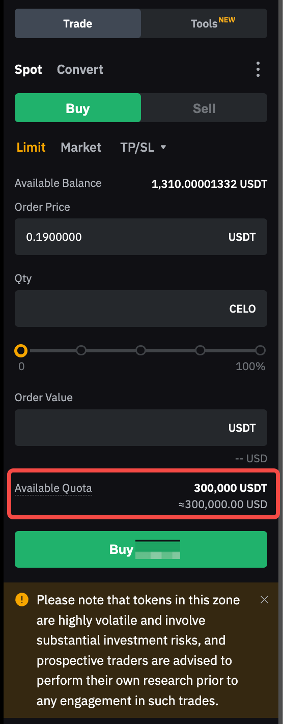 该信息可于交易页面上的“可用额度”部分查看。例如,若代币 ABC 的可用额度为 300,000 USDT,单价为 0.5 USDT,则您至多可持有 600,000 ABC(计算公式为 300,000 USDT ÷ 0.5 USDT = 600,000)。