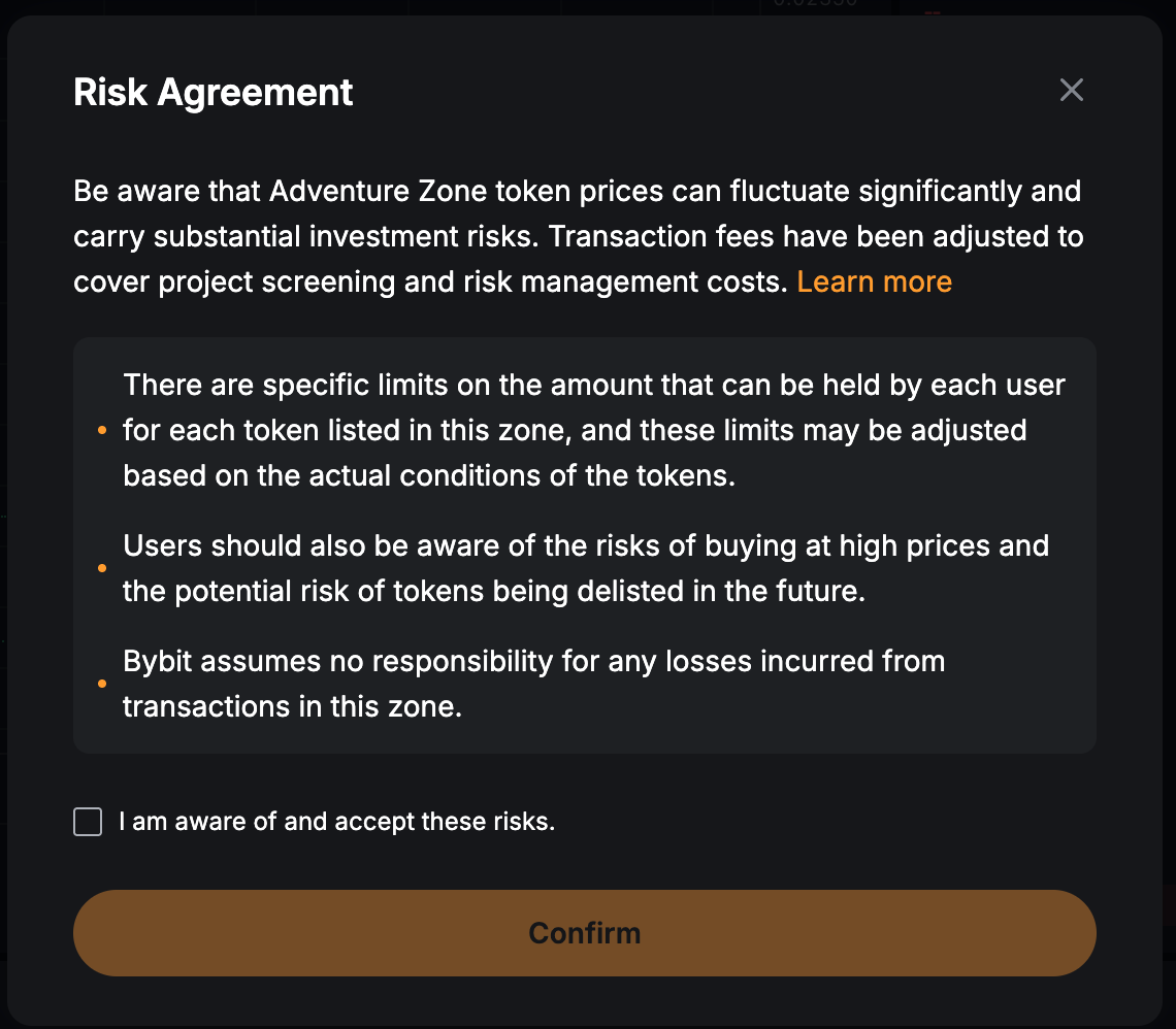 请注意,对于由风险投资区内的交易造成的任何损失,Bybit 概不负责。建议您仔细评估所有项目详情和风险,根据自身财务状况和风险承受能力,审慎做出投资决策。