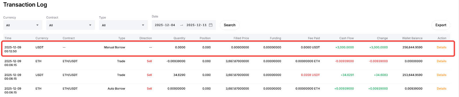 一旦手动借贷订单成功,借贷的货币将记入您的统一交易账户,并记录为“手动借贷”。您的钱包余额将相应更新。由于此操作不是交易,“数量”一栏将显示零,而“现金流”一栏将显示借入金额。