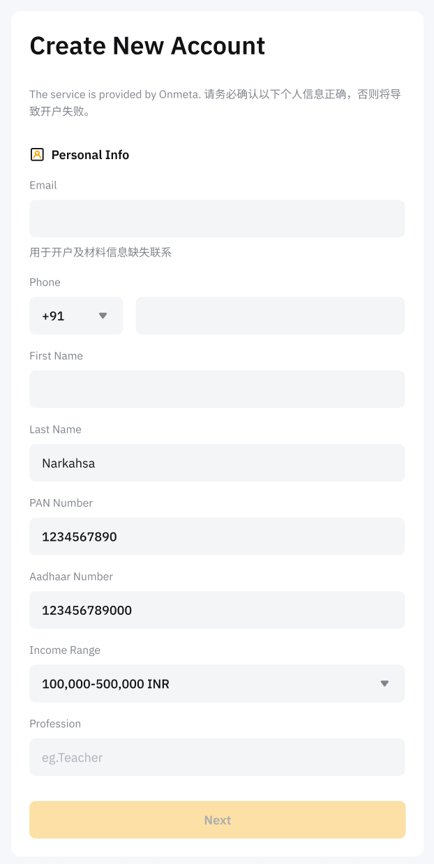 第 3 步:在创建新帐户页面上,填写您的个人信息,例如全名、电子邮件地址、电话号码、PAN 号码、Aadhaar 号码等。在某些情况下,您可能会被引导到第三方平台提交额外的身份信息。