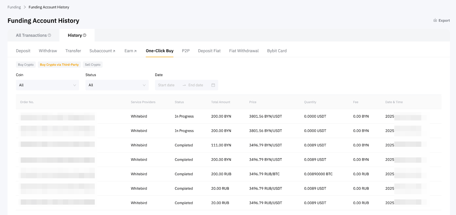 第 7 步: 在 Bybit 账户中成功购买加密货币后,您可以点击购买历史记录查看历史交易记录。