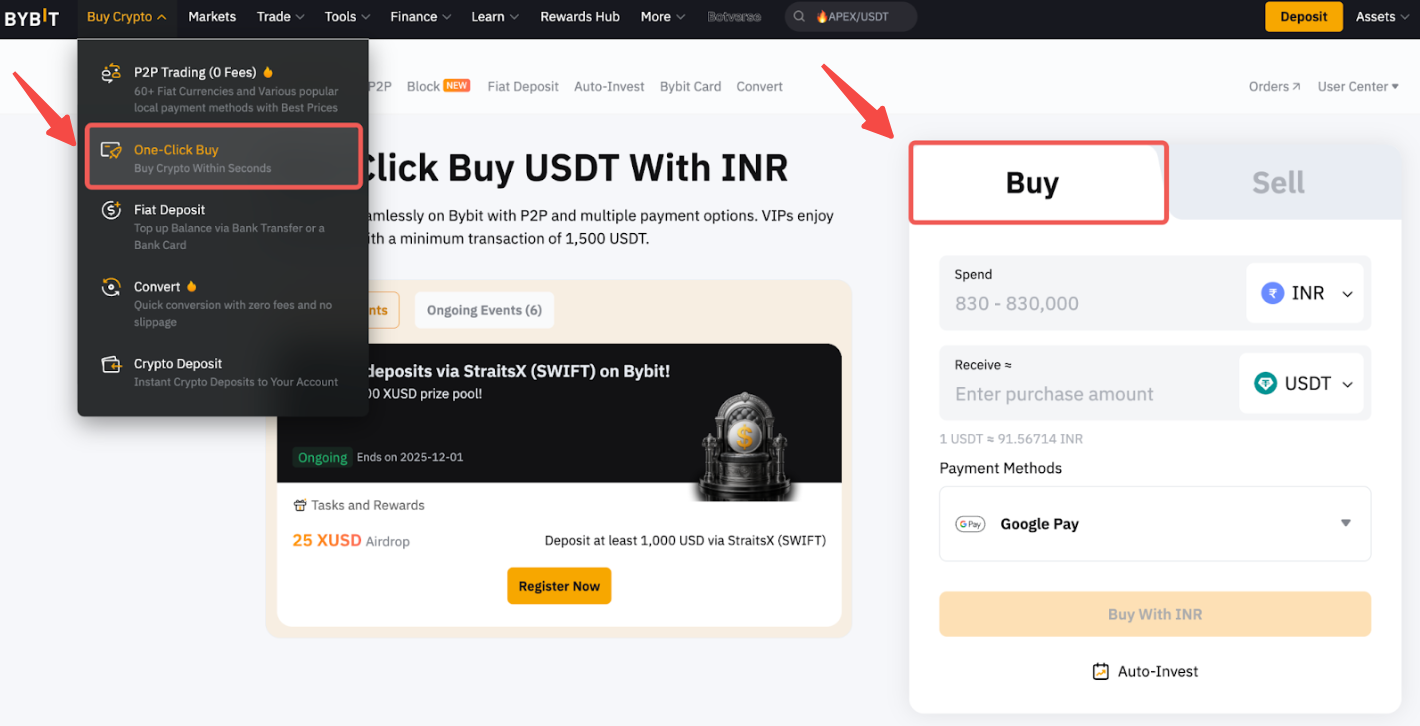第 3 步:在第 1 节中,选择您要支付的法币和您希望在 Bybit 账户中收到的代币。购买限额将在金额输入框中显示,具体金额因供应商而异。