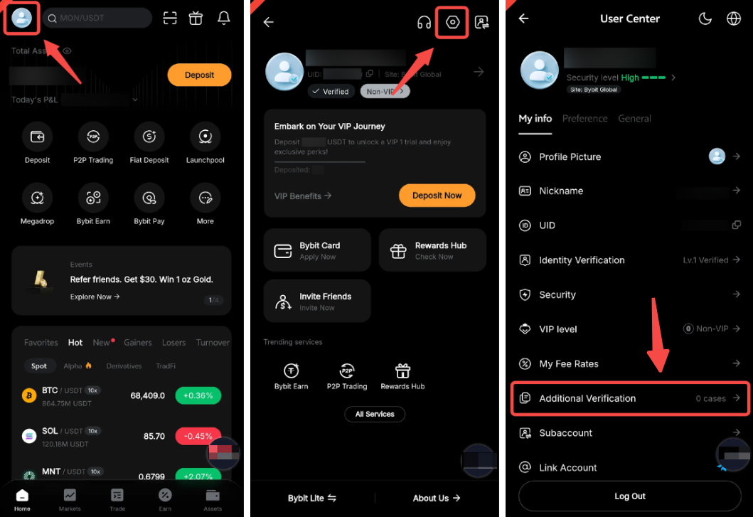 登录 Bybit App,然后前往个人资料图标设置附加验证