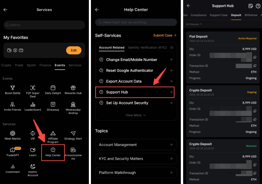 如果您的交易需要进行 EDD 验证才能处理,而您不想继续,可以按照以下步骤通过客服中心取消交易。