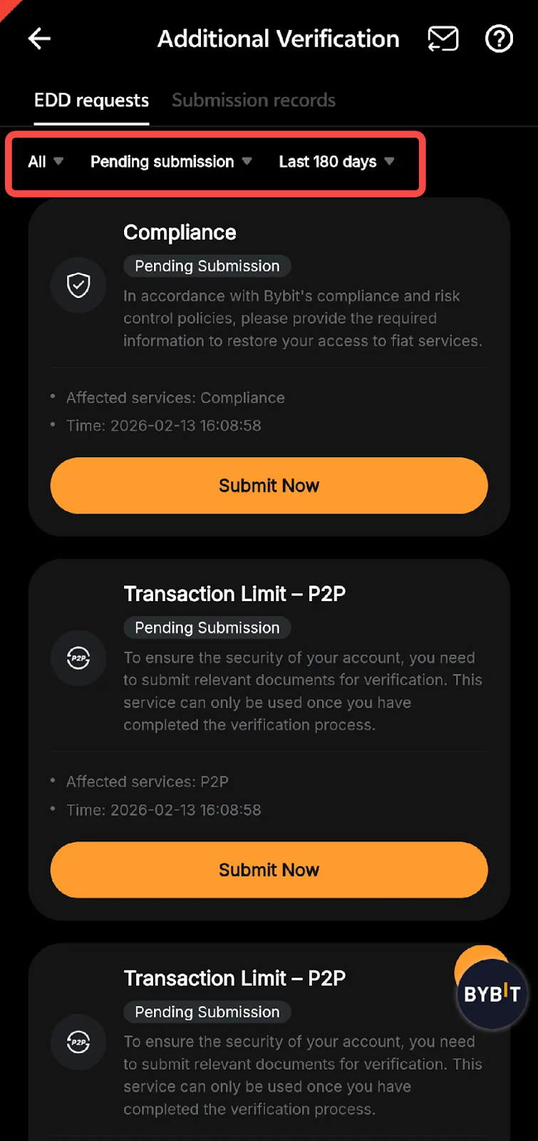 – 目前,可以取消充值、提币、跨赛区划转、法币买卖加密货币、Bybit Card 申请以及旅行规则涵盖的其他场景的 EDD 验证。
