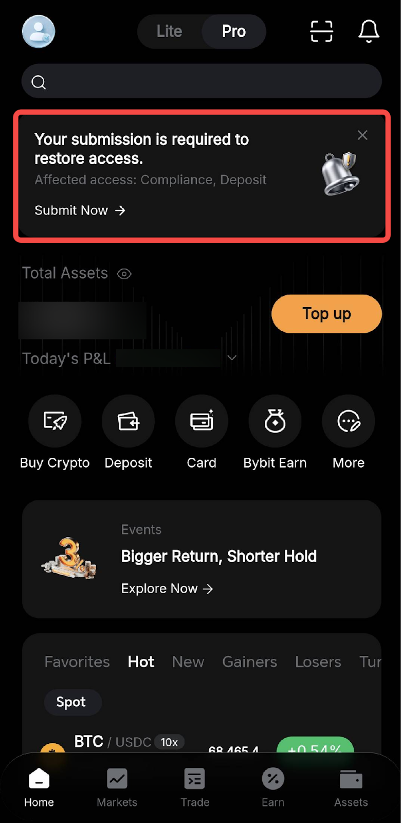 第 1 步:登录 Bybit APP。如果需要进行 EDD,首页顶部将显示提交提示。