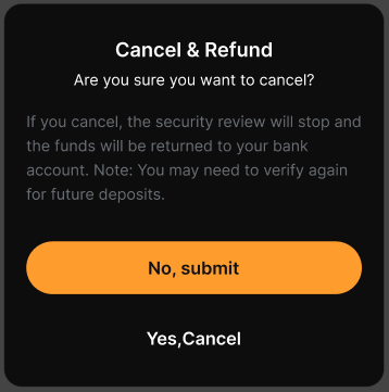– 只有当交易的 EDD 状态为待修改时,您才能取消交易。如果状态为审核中已拒绝,则无法取消,您需要提交所需信息才能完成验证。