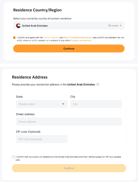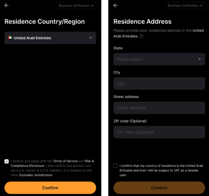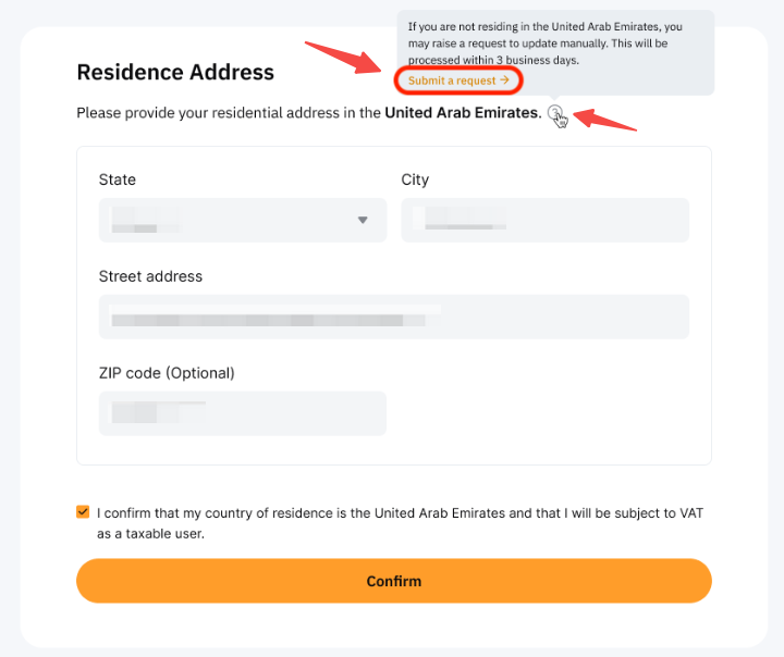 2. 输入您的居住地址,然后勾选复选框以确认您是阿联酋居民,并且作为应税用户需要缴纳增值税。