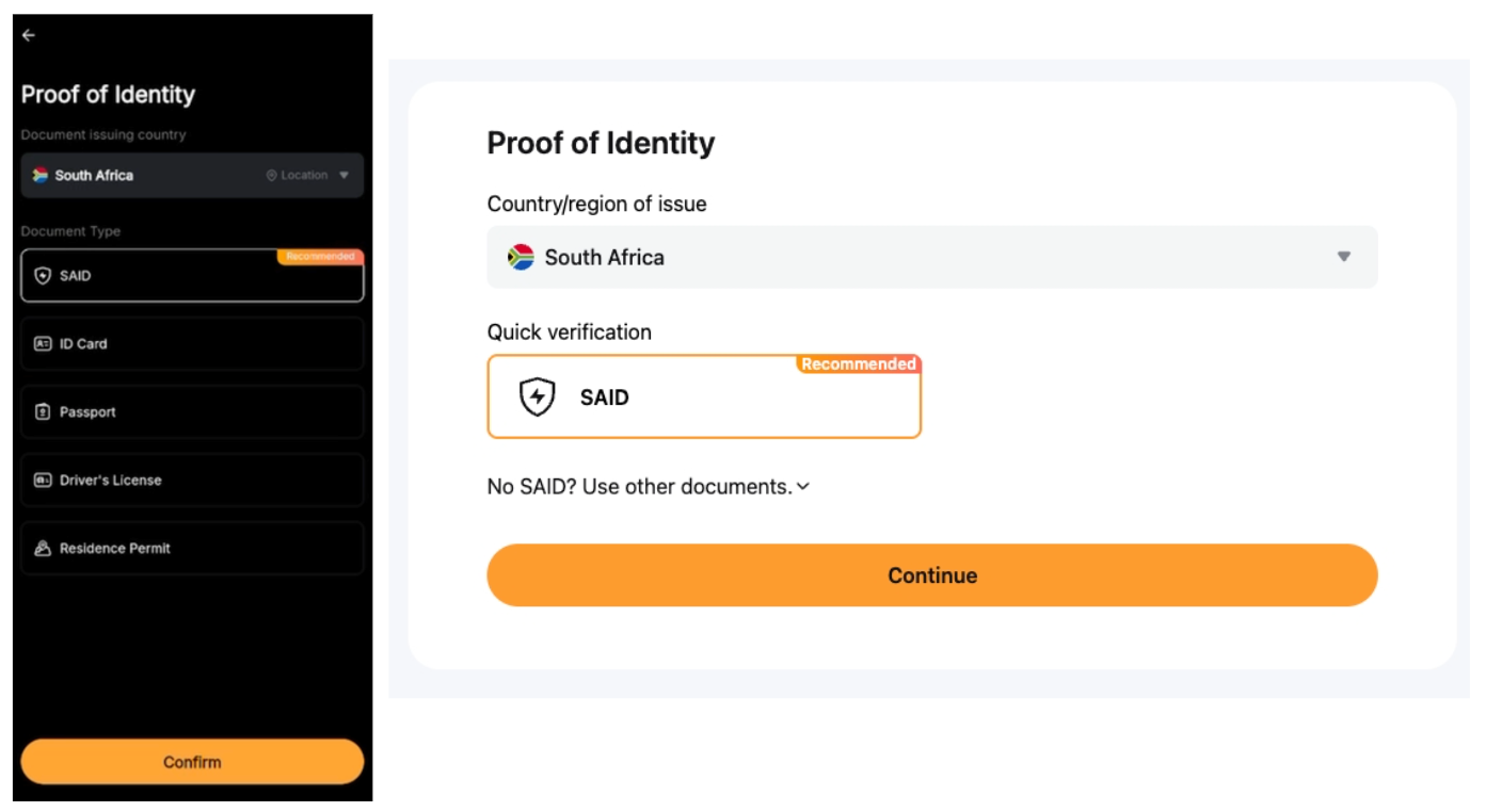 南非居民可以使用当地证件类型完成身份认证:SAID(南非身份证)。