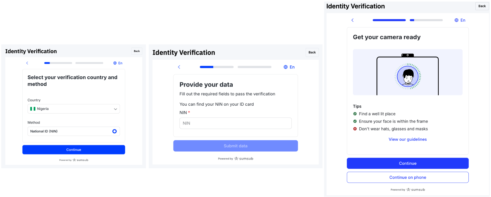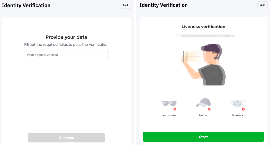 尼日利亚居民支持两 (2) 种本地证件认证类型:银行验证码 (BVN) 和身份证号 (NIN)。