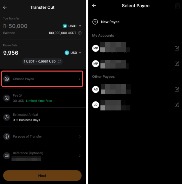 - 成功完成转账后,收款人将显示在最近添加的收款人,以便将来使用。