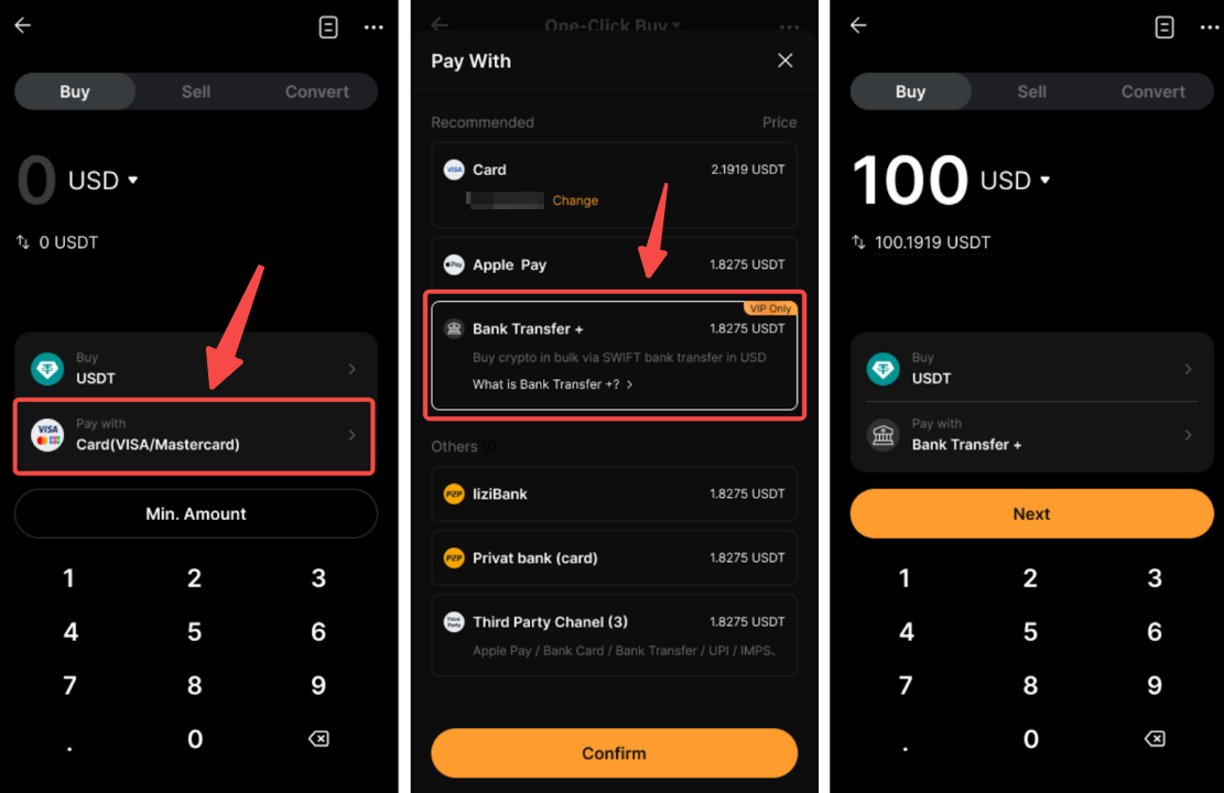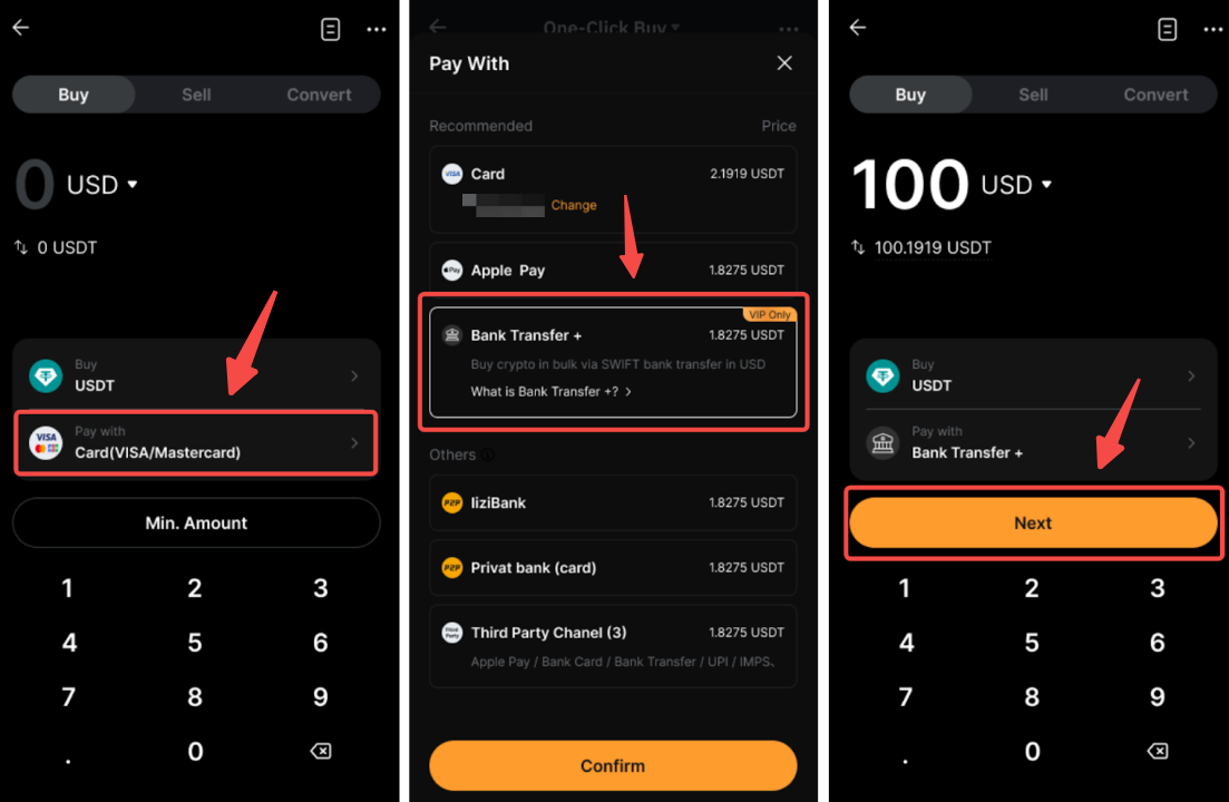 第一步:前往购买加密货币页面,选择银行转账 + 作为您的支付方式,通过点击Pay with,然后点击下一页继续。