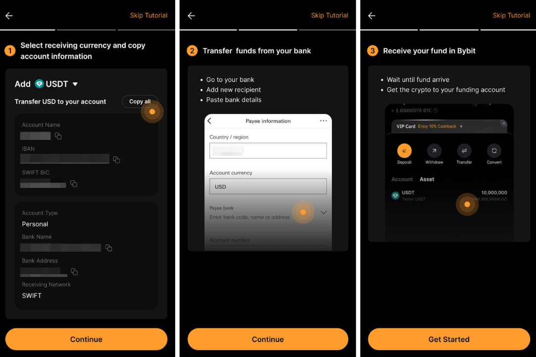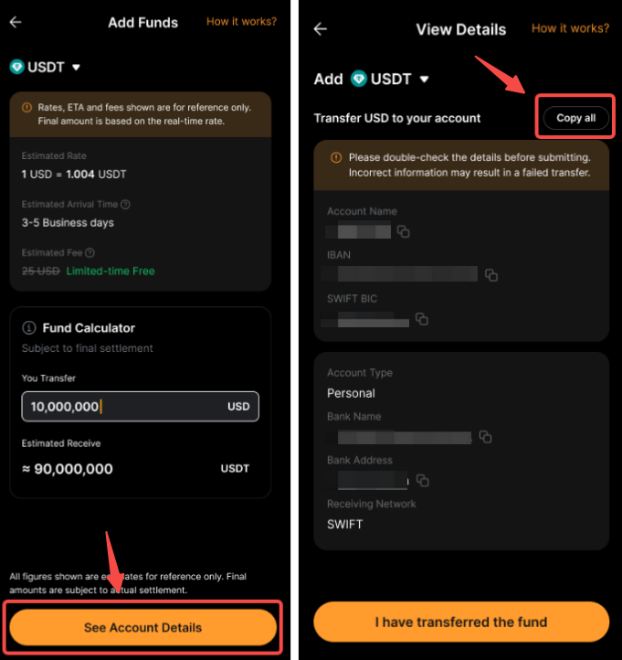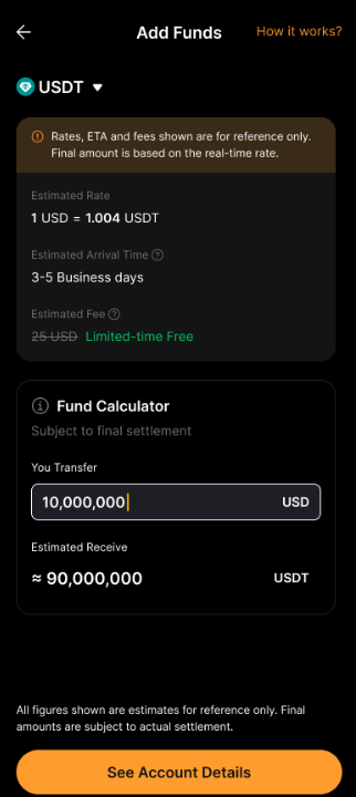 设置银行转账 + 后,您可以从您的银行账户转入法幣,并在资金账户中接收 USDT 或 USDC。