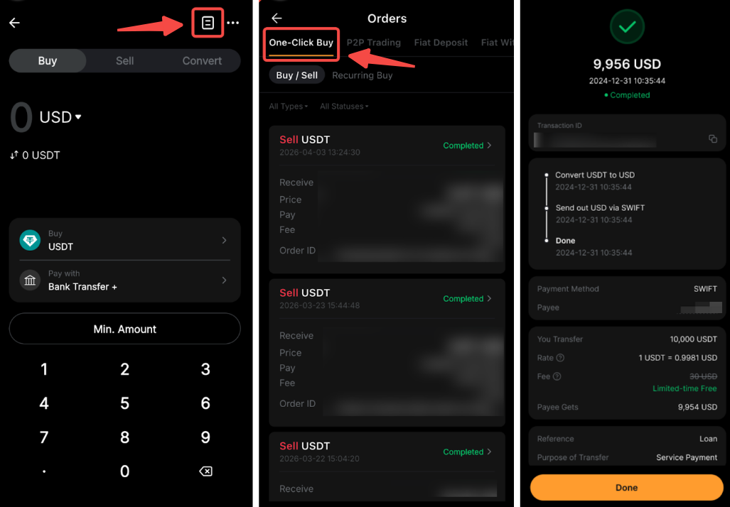 要检查您的转账状态,请前往买币页面,点击历史记录图标→ 快捷买币标签页。然后,选择相关的银行转账交易以查看更多详情。