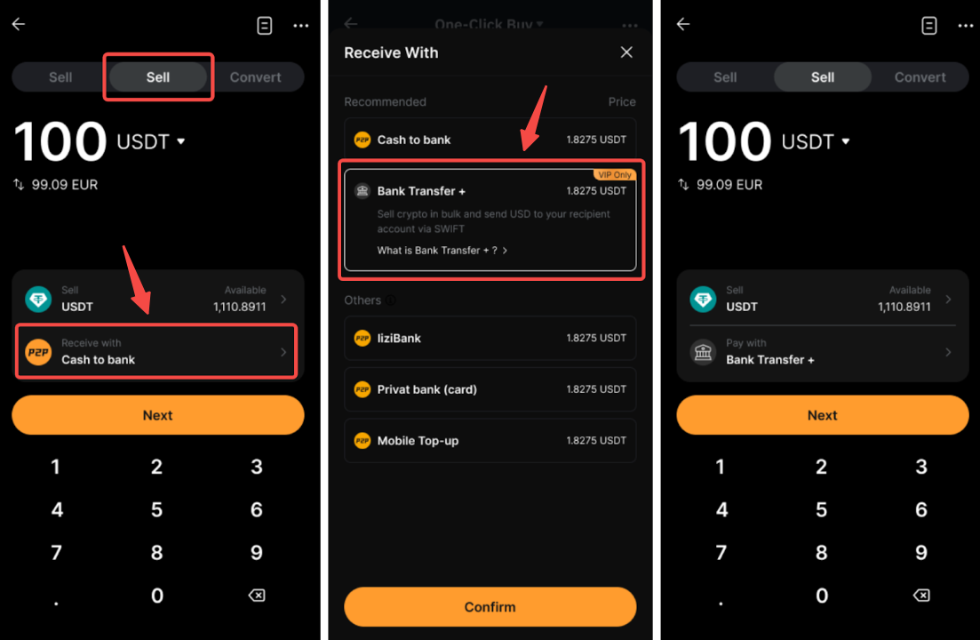 第 1 步:前往买币页面并切换至出售选项卡。确保您的收款方式已设置为银行转账 +,然后点击下一页继续。