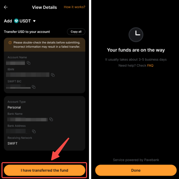 步骤 5:完成转账后,返回 Bybit App 并点击我已转账以查看转账状态。