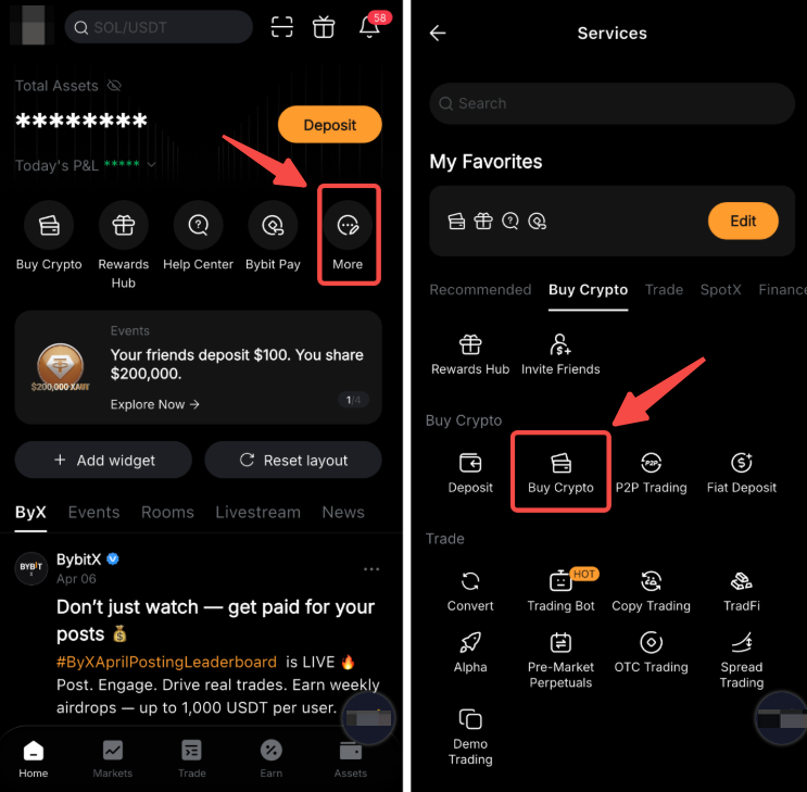 第 1 步:在 Bybit App 的首页,点击更多→快捷买币。