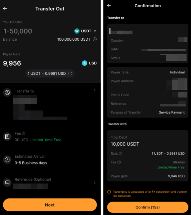 通过 银行转账 +,您可以将您的 USDT 或 USDC 作为 法幣 直接 提币 至外部 银行 账户。