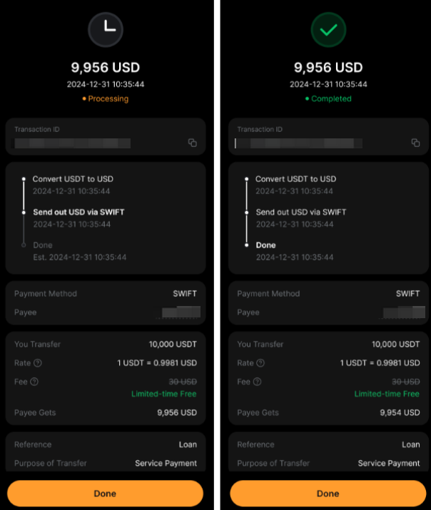 第 4 步: 在 订单记录 页面上追踪转账状态。一旦转账完成,您将收到推送通知和电子邮件。