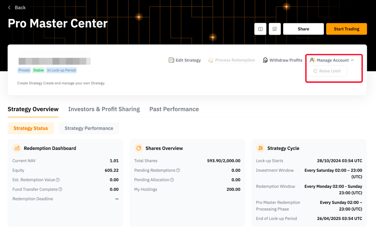 您可以在“管理账户”→“提高限额”中提高份额限额,以便在投资窗口期间容纳更多投资者的资金。 当您选择增加交易量时,您还必须贡献额外的达人余额,才能成功完成扩容。