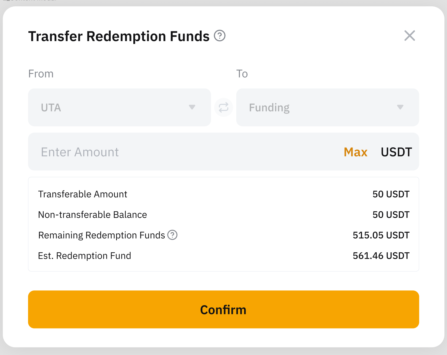 - 可转金额:该金额代表 Pro 达人的统一交易账户 (UTA) 中可划转的 USDT 金额。若该金额低于申购者赎回资产所需的金额,则 Pro 达人有责任管理其订单和仓位,释放出充足资金。