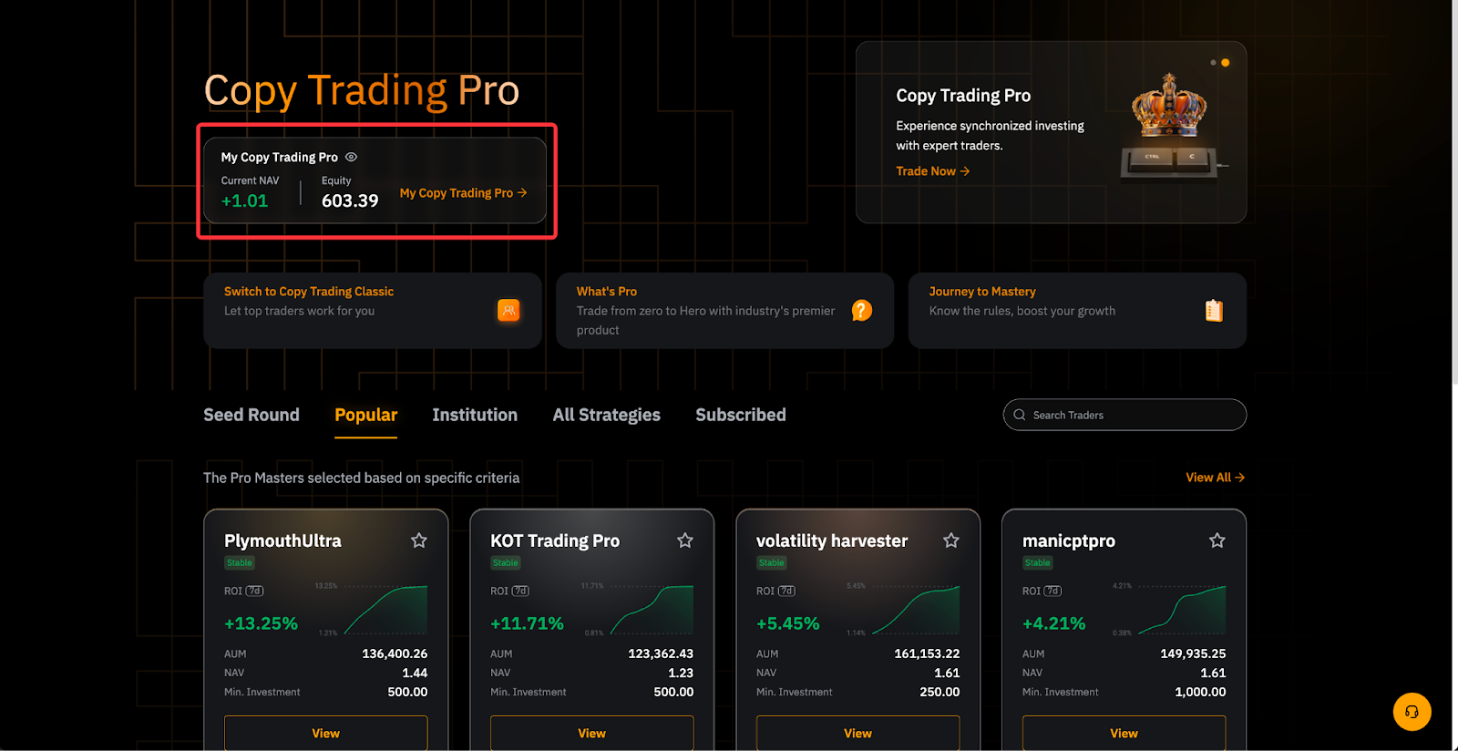 前往跟单交易 Pro → Pro 达人中心。 您可以点击产品页面左上角的跟单交易 Pro 策略摘要卡访问页面。
