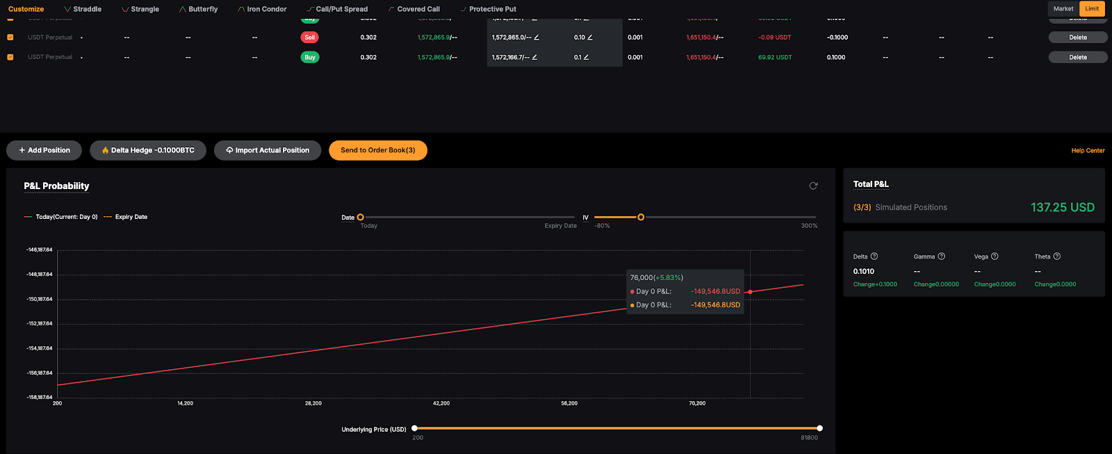 最多可自定义 200 个 USDT 永续、USDC 永续、USDC 交割和 USDC 期权合约仓位。此外,您还可以在不同的市场行情和投资理念下,探索跨式策略、蝶式策略、铁鹰策略、勒式策略、看涨/看跌价差策略、备兑看涨策略和保护性看跌策略的可能性。