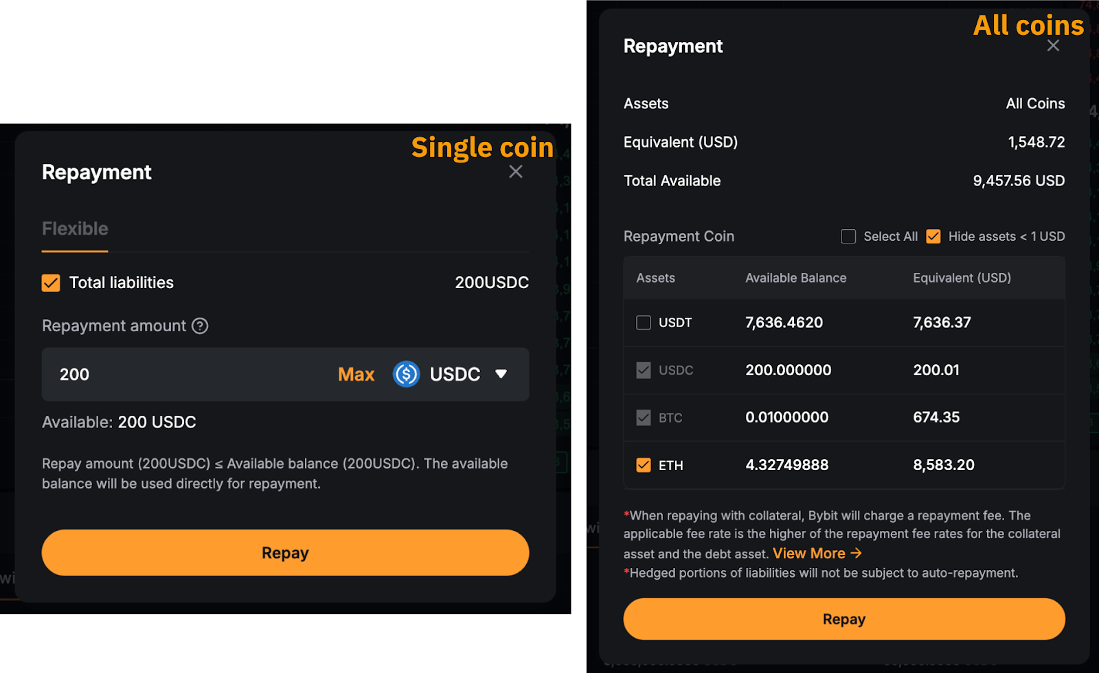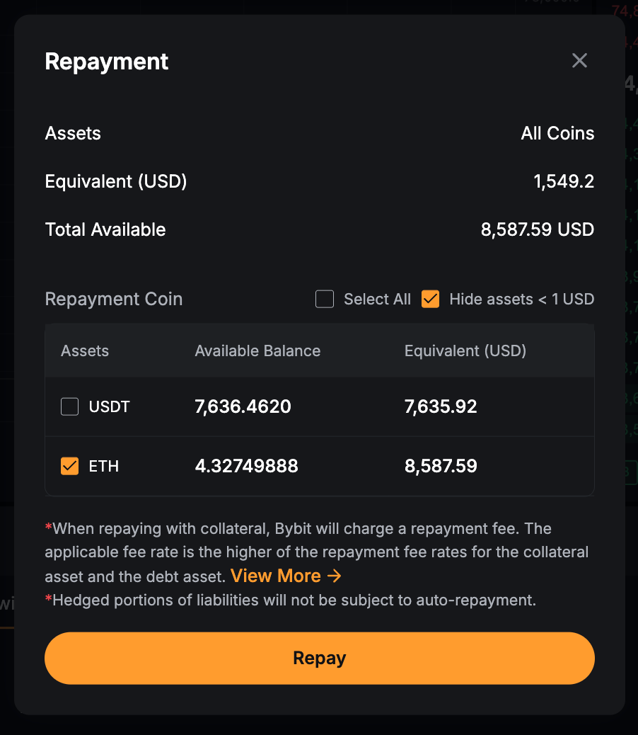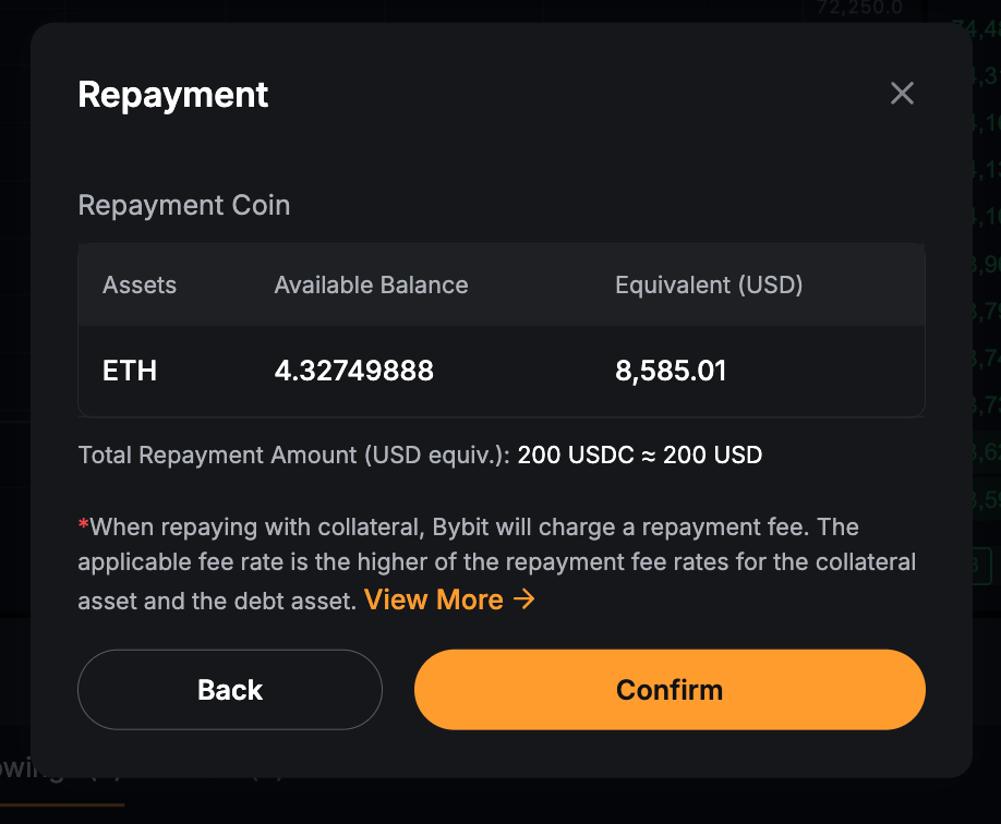 确认后,系统将首先使用您可用的借用货币进行还款。任何剩余负债将通过把抵押资产转换为借入货币来偿还。如果还款需要兑换,Bybit 将对总还款金额收取一笔手续费。手续费率按抵押资产和借入资产中较高的还款手续费率收取。