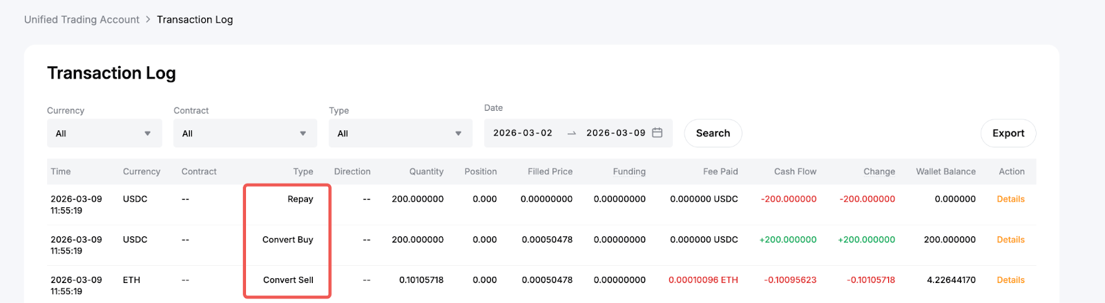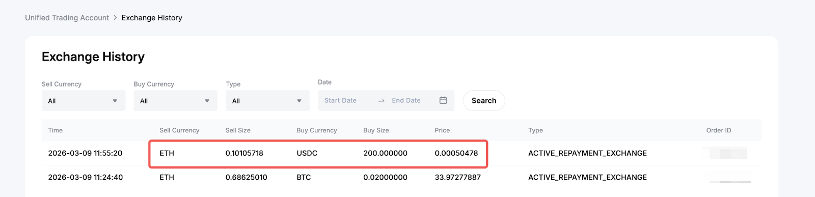 在您的交易日志中,您可以在闪兑和还款交易类型下找到每个还款的详细信息,这些交易类型以相同的时间戳和订单 ID 顺序列出。闪兑交易表示所选抵押资产的任何自动转换,以偿还借入金额。只有当您的余额中没有足够的借用货币进行还款,并且需要转换时,才会出现。同时,还款交易显示您为借入的货币支付的金额。