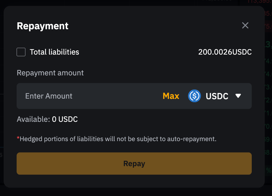 注意:如果您的可用余额中有借入的货币,将自动选择资产进行还款。