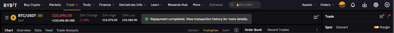 — 现在支持全额、部分和混合还款(借入货币 + 兑换)。但是请注意,通过资产转移或现货交易(即,将其他保证金资产出售到借入的货币中)完成的任何还款将仅支付您的衍生品借款的未偿还金额。任何现货借款仍将保留,且必须手动支付。