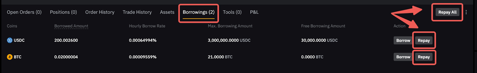 - 要偿还所有借入的货币,请单击统一交易页面顶部的全部还款。