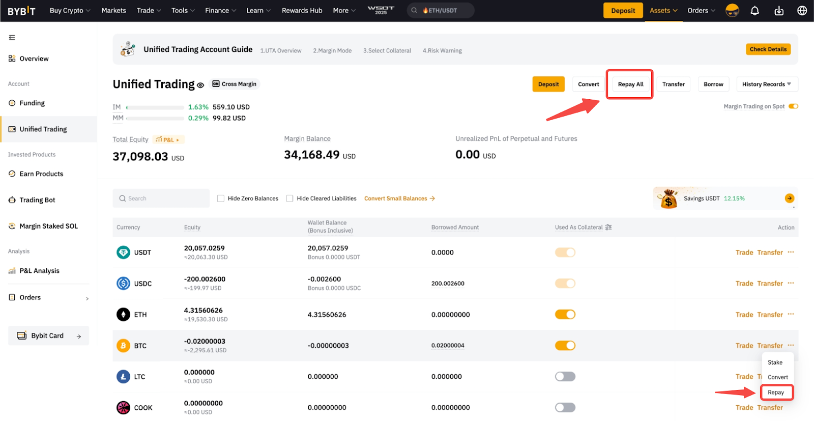 以下是有关如何在 Bybit 上的统一交易账户 (UTA) 中进行手动还款的分步指南。有关如何发生借款的更多信息,请访问此处。