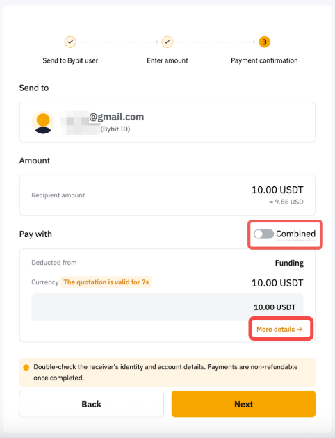 Bybit Pay 内部转账允许您立即发送法定资产后,让您的收款人接收加密货币,或发送加密货币,让您的收款人接收加密货币或法定资产,所有这些操作都无需支付交易费用。目前,通过此功能发送法定资产仅在 Bybit 应用程序上可用。网络支持即将推出。