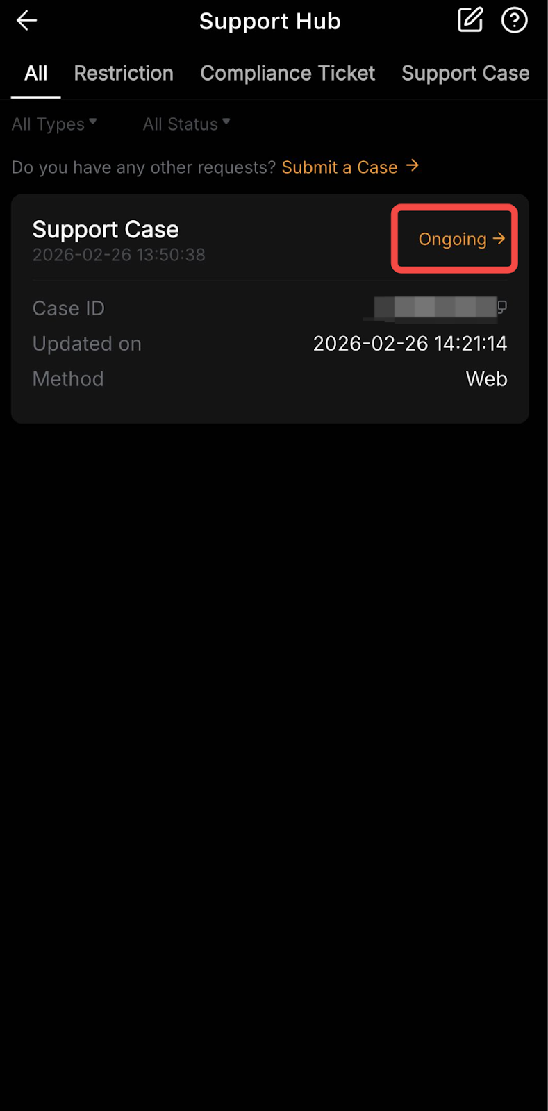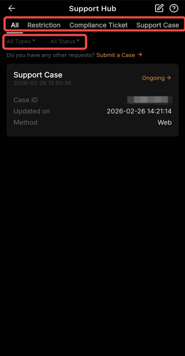 - 选项卡:选择您想查看的特定工单类型,例如充值、提币和客服工单,或选择全部以查看您提交的所有工单。