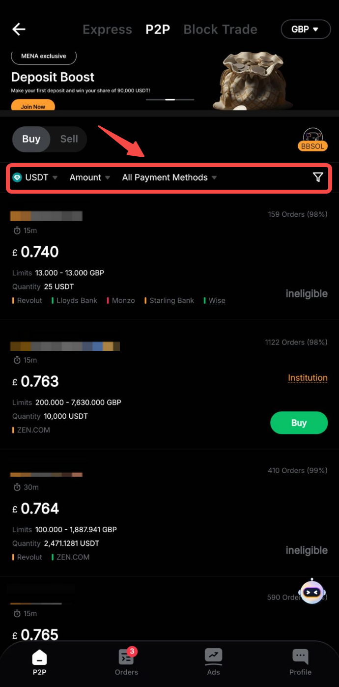 第 2 步:在“买入”页面上,您可以根据您的交易要求,通过选择所需的法定货币或付款方式 — 法定余额标准来筛选广告商。