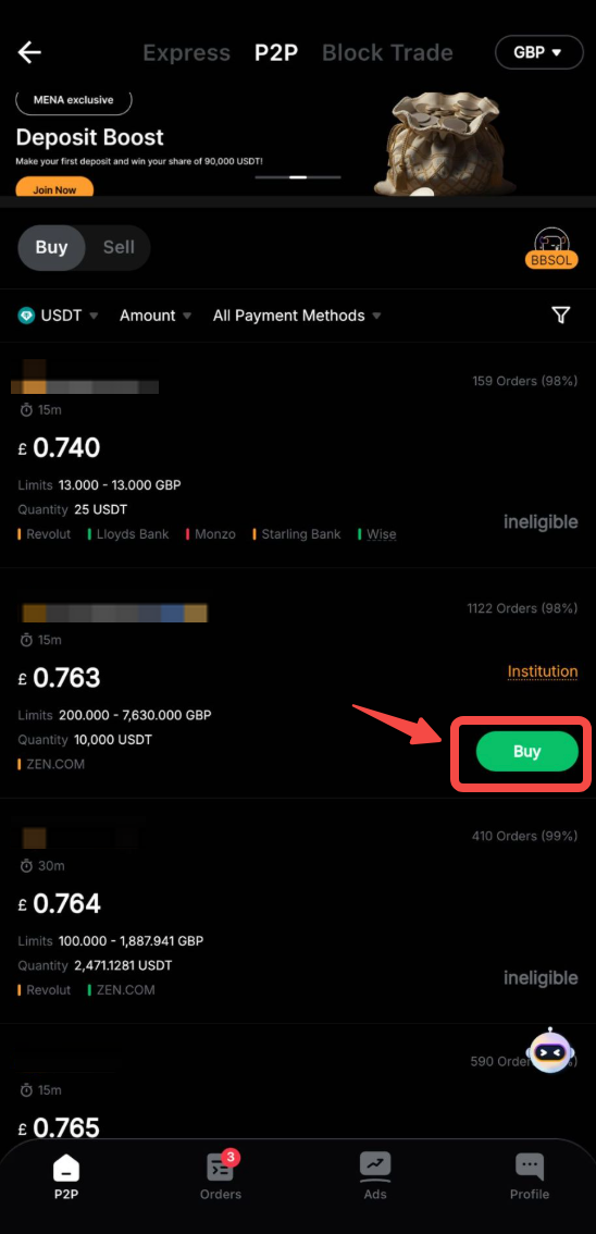 第 3 步:选择您的首选广告商,然后单击买入。请确保您选择的广告商支持法币付款。