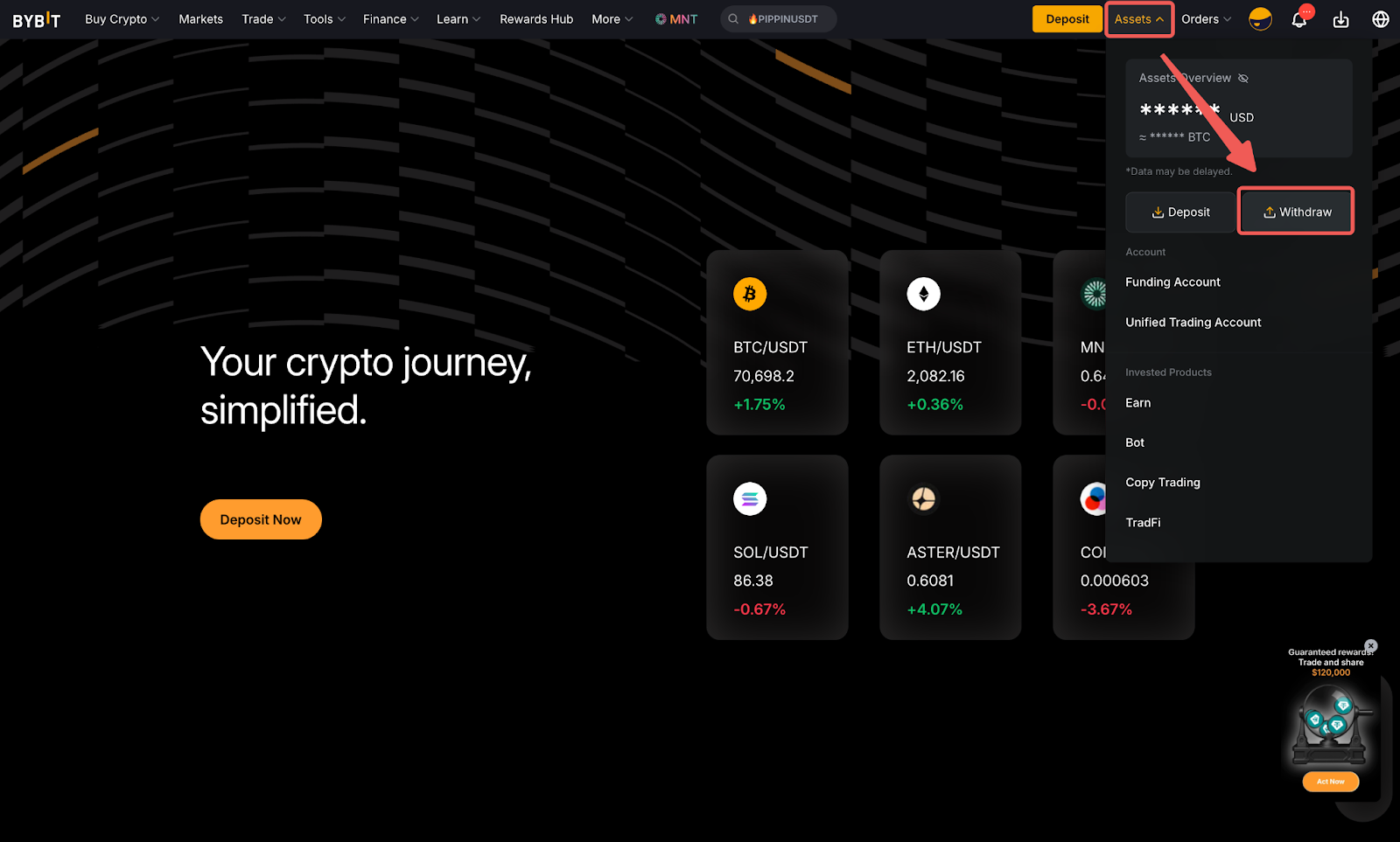 第 1 步: 将光标悬停在 Bybit 主页右上角的资产上,然后点击提币。