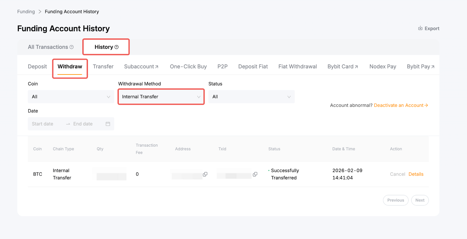 如需查看内部转账历史,请前往资金账户 → 历史,然后在提币方式一栏中选择内部转账。如果您是收款方,请在充值 → 充值方式一栏中选择内部转账。