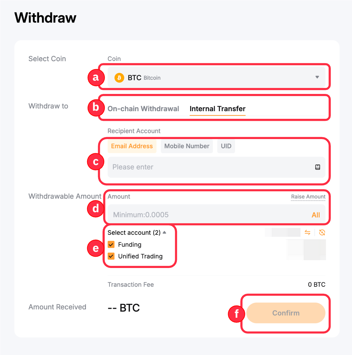 e. 选择账户:勾选可用复选框,选择您想要从哪个账户提币。您可以选择从资金账户、统一交易账户或两者提币。