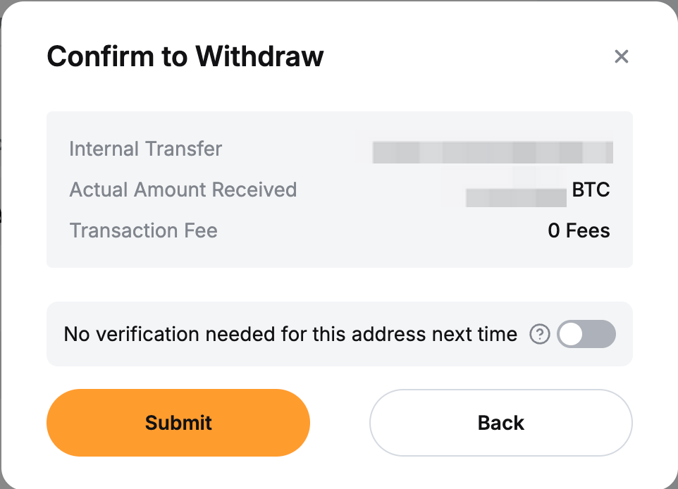 第 3 步: 在弹窗中点击提交 ,您将被引导至提币验证页面。